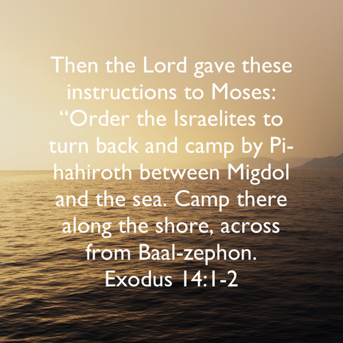 “Then the Lord gave these instructions to Moses: “Order the Israelites to turn back and camp by Pi-hahiroth between Migdol and the sea. Camp there along the shore, across from Baal-zephon.” –Exodus 14:1-2 NLT