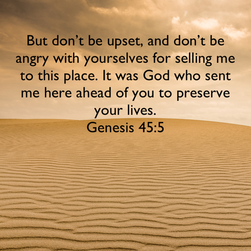 "But don't be upset, and don't be angry with yourselves for selling me to this place. It was God who sent me here ahead of you to preserve your lives." –Genesis 45:5 NLT