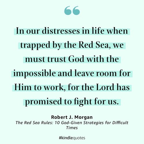 “In our distresses in life when trapped by the Red Sea, we must trust God with the impossible and leave room for Him to work, for the Lord has promised to fight for us. Search this out in Scripture, and you’ll discover it’s one of the truths the Lord most often repeats.” –The Red Sea Rules, by Robert J. Morgan (Rule 5)