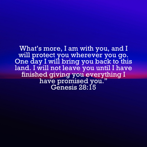 “What’s more, I am with you, and I will protect you wherever you go. One day I will bring you back to this land. I will not leave you until I have finished giving you everything I have promised you.” –Genesis 28:15 NLT