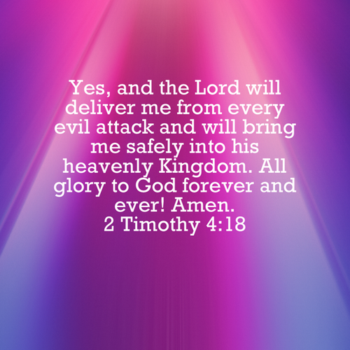 "Yes, and the Lord will deliver me from every evil attack and will bring me safely into his heavenly Kingdom. All glory to God forever and ever! Amen." –2 Timothy 4:18 NLT
