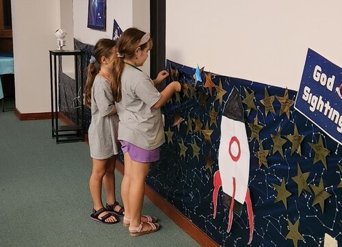 What is a God-Sighting you may ask? Well, each morning during Vacation Bible School, we ask the kids to share some way they saw God at work the day before. Their crew leaders then wrote what had been shared on a star and the stars were hung on the walls in the sanctuary.