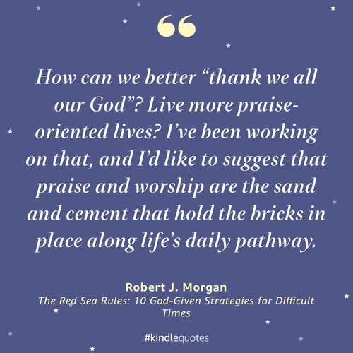 How can we better “thank we all our God”? Live more praise-oriented lives? I’ve been working on that, and I’d like to suggest that praise and worship are the sand and cement that hold the bricks in place along life’s daily pathway. –The Red Sea Rules, by Robert J. Morgan (Rule 10)