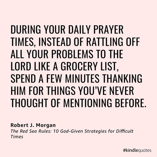 During your daily prayer times, instead of rattling off all your problems to the Lord like a grocery list, spend a few minutes thanking Him for things you've never thought of mentioning before. –The Red Sea Rules, by Robert J. Morgan (Rule 10)
