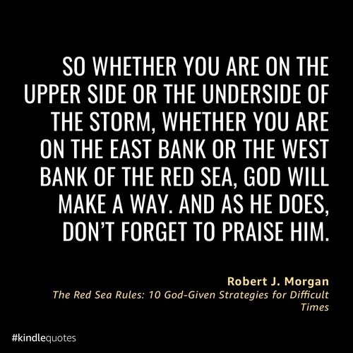 So whether you are on the upper side or the underside of the storm, whether you are on the east bank or the west bank of the Red Sea, God will make a way. And as He does, don't forget to praise Him. –The Red Sea Rules, by Robert J. Morgan (Rule 10)