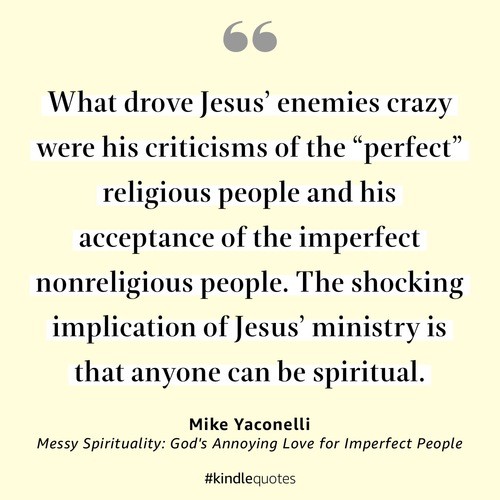 "What drove Jesus’ enemies crazy were his criticisms of the “perfect” religious people and his acceptance of the imperfect nonreligious people. The shocking implication of Jesus’ ministry is that anyone can be spiritual." (Messy Spirituality by Mike Yaconelli. p. 21)