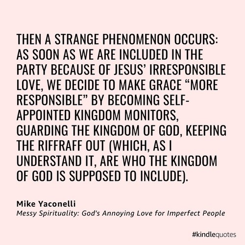 “Then a strange phenomenon occurs: as soon as we are included in the party because of Jesus’ irresponsible love, we decide to make grace “more responsible” by becoming self-appointed Kingdom Monitors, guarding the kingdom of God, keeping the riffraff out (which, as I understand it, are who the kingdom of God is supposed to include).” (Messy Spirituality by Mike Yaconelli. p. 65)