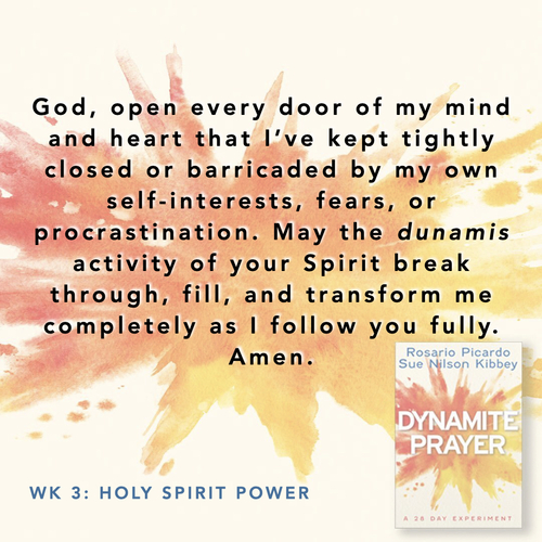 God, open every door of my mind and heart that l've kept tightly closed or barricaded by my own self-interests, fears, or procrastination. May the dunamis activity of your Spirit break through, fill, and transform me completely as I follow you fully. Amen.