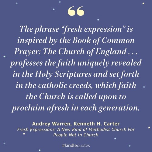“The phrase “fresh expression” is inspired by the Book of Common Prayer: The Church of England . . . professes the faith uniquely revealed in the Holy Scriptures and set forth in the catholic creeds, which faith the Church is called upon to proclaim afresh in each generation.” (Fresh Expressions: A New Kind of Methodist Church For People Not In Church)