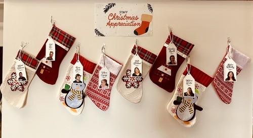 In the worship center, you'll find a stocking for all of our staff, including our worship musicians and nursery workers. You can drop notes and cards to those you want to show appreciation to. We'll leave the stockings up through the New Year.