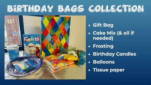 Don't forget about the Birthday Bags for the Green Cove Food Pantry. These bags are given to anyone who comes in and had a birthday coming up. This is such a fun shopping trip with your child. You can get all the required items from the dollar store costing less than $10.